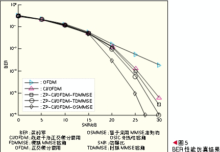 BER性能仿真結(jié)果如圖5所示。在圖5中,F(xiàn)DMMSE、TDMMSE和OSMMSE分別代表了ZP-CI/OFDM系統(tǒng)中的頻域MMSE檢測(cè)、時(shí)域MMSE檢測(cè)和基于采用MMSE準(zhǔn)則的OSIC非線性檢測(cè)。