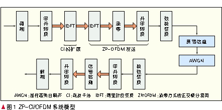 傳統(tǒng)的OFDM系統(tǒng)在添加保護(hù)間隔時(shí)采用循環(huán)前綴(CP)方式來(lái)消除符號(hào)間干擾。最近的研究表明,采用添零(ZP)方式來(lái)代替CP所形成的ZP-OFDM系統(tǒng)可以在信道深衰落的情況下保證傳輸符號(hào)的恢復(fù),從而較傳統(tǒng)基于CP的OFDM系統(tǒng)而言具有更好的誤碼率(BER)性能[9]。