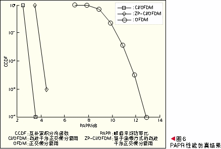 在PAPR的性能仿真中,我們引入互補(bǔ)累積分布函數(shù)(CCDF)來(lái)描述信號(hào)的PAPR。圖6所示為在16-QAM調(diào)制下的ZP-CI/OFDM、CI/OFDM和OFDM這3種信號(hào)的PAPR性能仿真結(jié)果。由圖6的仿真結(jié)果可以看出,CI-OFDM系統(tǒng)由于CI碼的引入從而具有很低的PAPR,ZP-CI/OFDM系統(tǒng)由于以添零的方式作為保護(hù)間隔使得PAPR略有提高,但也明顯低于傳統(tǒng)的OFDM系統(tǒng)。因此,ZP-CI/OFDM系統(tǒng)以較小的PAPR提高為代價(jià),換取了更大的BER增益。