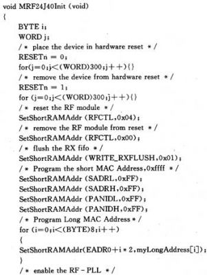 由MRF24J40構成的IEEE802.15.4無線收發(fā)電路必須在微控制器的控制下,才能夠在IEEE802.15.4網絡中應用。電路中進行數據的發(fā)送和接收前,必須完成器件的初始化設置。MRF24J40的初始化程序如下所示: