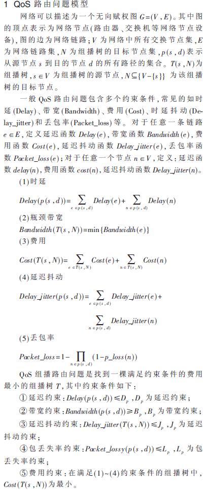 隨著網(wǎng)絡應用越來越廣泛,在傳統(tǒng)的HTTP、FTP、E-mail等數(shù)據(jù)業(yè)務的基礎上增加了各種實時和多媒體業(yè)務。要滿足這些業(yè)務的需求,特別是要保證一些實時業(yè)務的帶寬、時延等特殊需求,僅以目前Internet中“盡最大努力交付”的服務是難以完成的[1]。因此,組播技術的研究成為這個領域的熱點,同時也對于組播的服務質量提出了更高的要求,QoS組播的需求已成為Internet相關技術的研究熱點。Qos組播路由技術是網(wǎng)絡支持QoS保證的關鍵技術之一,因此,高效的QoS組播路由算法就顯得至關重要。而QoS路由的目的就是在網(wǎng)絡中尋找滿足用戶對線路的帶寬、延遲、延遲抖動、費用要求的路由,即向用戶提供端到端的服務質量保證,而基于多個不相關可加度量的QoS路由問題是NP完全問題。目前一般采用智能優(yōu)化算法來求解,如遺傳算法、蟻群算法、模擬退火算法等。