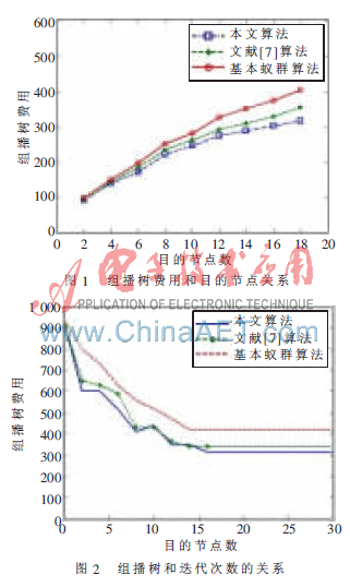 圖2表示網(wǎng)絡費用與迭代次數(shù)的關系,目的節(jié)點為20個,從圖中可以看出,隨著迭代次數(shù)的增加,該算法比基本蟻群算法具有更快的收斂性,最終組播樹的費用也更低,與參考文獻[7]算法相比收斂速度上相差無幾,但是最終最優(yōu)組播樹的費用更低。