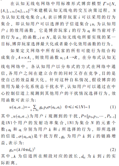 博弈論(Game Theory)[6]是一系列可以用來分析、研究交互決策過程的模型和工具。認(rèn)知無線電網(wǎng)絡(luò)存在多個認(rèn)知用戶,每一個認(rèn)知用戶參數(shù)的調(diào)整均會影響到其他認(rèn)知用戶,由此形成交互過程。因此可以使用博弈理論分析認(rèn)知無線電交互決策問題,每個認(rèn)知用戶可以根據(jù)環(huán)境觀測結(jié)果調(diào)整參數(shù)逼近所要實現(xiàn)的目標(biāo),一般認(rèn)知無線電觀測到的結(jié)果為網(wǎng)絡(luò)工作環(huán)境,比如干擾環(huán)境等。