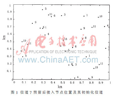 假設(shè)信道7為預(yù)留信道,m=7,圖1給出了某一較短時間內(nèi)各認(rèn)知用戶的接入節(jié)點位置及其初始化信道,其中黑點表示節(jié)點的位置,黑點右邊的數(shù)字表示初始化信道。由于網(wǎng)絡(luò)中的可用信道為互不重疊的正交子信道,所預(yù)留的信道7自然不存在受環(huán)境影響的可能,從而該預(yù)留適用于所有網(wǎng)絡(luò)覆蓋范圍。
