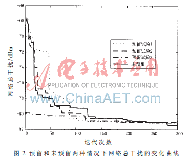 以下為本文所提出的動態(tài)預(yù)留信道選擇方法的仿真分析。在網(wǎng)絡(luò)運行過程中,所有節(jié)點觀測來自其他節(jié)點的干擾信號能量,并調(diào)整節(jié)點參數(shù)使得網(wǎng)絡(luò)總干擾減小。圖2給出了具有動態(tài)預(yù)留信道和未預(yù)留的網(wǎng)絡(luò)總干擾隨迭代次數(shù)的變化曲線,干擾中包括了噪聲功率,其中預(yù)留試驗在初始信道一定的條件下進(jìn)行了3次試驗。從圖中4條曲線可以看出,網(wǎng)絡(luò)總干擾隨著節(jié)點參數(shù)調(diào)整而不斷減小,這驗證了嚴(yán)格位勢博弈NE的存在性和收斂性,保證了認(rèn)知無線電DSCR方法的可行性。從圖中還可以看出,相比未預(yù)留的網(wǎng)絡(luò),具有信道預(yù)留的網(wǎng)絡(luò)僅增加了少量干擾,然而收斂速度卻快于前者。