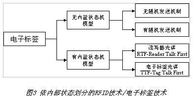 電子標(biāo)簽工作時(shí)的內(nèi)部狀態(tài)在很大程度上決定著讀寫器的工作方式及設(shè)計(jì)方案,比如RFID系統(tǒng)是否支持同一閱讀區(qū)中的多標(biāo)簽讀寫功能等。依電子標(biāo)簽內(nèi)部狀態(tài)的RFID技術(shù)/電子標(biāo)簽技術(shù)分類如圖3所示。