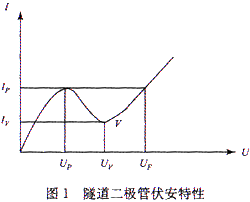 隧道二極管是一個PN結二極管,其特性曲線如圖1所示。它與普通二極管特性曲線有很大不同,在電壓U很小時,電流I已經(jīng)相當大了,而電壓U增大到一定數(shù)值時,電流I反而下降,呈負阻性。電壓U為負值并且不大時,也有相當大的反向電流。隧道二極管的特殊性質(zhì)是由于半導體摻雜特別重,導致阻擋層厚度特別薄,約為10-6cm,而普通二極管的阻擋層厚度約為10-4cm,從而導致二極管內(nèi)的載流子除了以擴散方式移動以外,還以隧道效應移動,在反向狀態(tài)下,流過二極管的電流主要是隧道電流,遠遠大于普通二極管的反向飽和電流,由于隧道效應,隧道二極管內(nèi)沒有少數(shù)載流子存儲效應,從而使隧道二極管能工作于超高速狀態(tài),目前隧道二極管能產(chǎn)生邊沿時間為20ps的高速脈沖。隧道二極管的伏安特性可用5個參數(shù)來表征:(1)峰點電壓VP;(2)谷點電壓VV;(3)峰點電流IP;(4)谷點電流IV;(5)前向電壓VF(投影峰點電壓-與峰點相對應的第二個正電阻區(qū)的電壓)。