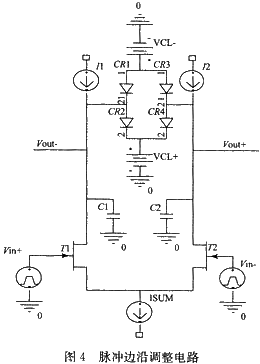 對脈沖邊沿的調(diào)整過程如下:2個場效應管(NE321000)構成高速開關,控制差分輸入信號的通斷。電流源I1、I2、I3之間的關系為I1+I2=I3。當輸入信號VIN+的上升沿到來時,可知VIN-幅度下降。此時T1導通,T2關斷。電容C1上的電流為IC1=I1-I3=-I2,C1放電,調(diào)整VOUT-的下降沿;電流源I2對電容C2充電,調(diào)整VOUT+的上升沿。當C1上的電壓下降到(VCL)-VCR1時,二極管CR1導通,C1不再放電,VOUT-的低電平被鉗在(VCL)-VCR1上;同理,C2上的電壓上升到(VCL)+VCR4時,CR4導通,C2不再充電,OUT+的高電平被固定在(VCL+)+VCR4上。電容電流脈沖的上升、下降時間。電路的仿真結果如下:與電容電壓之間有關系式:CU=∫Idt,從這個公式中要計算出脈沖的邊沿時間比較困難,可以將流過電容的電流近似看作一個三角波,由此可得到脈沖上升、下降時間與脈沖幅度、充放電電流和電容之間的關系式:T≈2CU/I??芍?,改變電流I1、I2、ISUM和電容C的大小即可調(diào)整脈沖的上升下降時間。