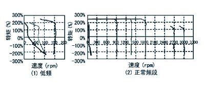 無速度傳感器的矢量控制變頻器不僅改善了轉(zhuǎn)矩控制的特性,而且改善了針對各種負(fù)載變化產(chǎn)生的不特定環(huán)境下的速度可控性。圖3所示,為某品牌無速度傳感器變頻器產(chǎn)品在低頻和正常頻段時(shí)的轉(zhuǎn)矩測試數(shù)據(jù)(電機(jī)為5.5kw/4極)。從圖中可知,其在低速范圍時(shí)同樣可以產(chǎn)生強(qiáng)大的轉(zhuǎn)矩。在實(shí)驗(yàn)中,我們同樣將2hz的矢量變頻控制和v/f控制變頻進(jìn)行比較發(fā)現(xiàn),前者具有更強(qiáng)的輸出力矩,切削力幾乎與正常頻段(如30hz或50hz)相同。
