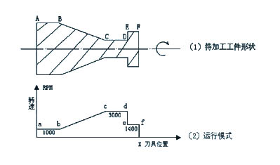 不使用變頻器進(jìn)行變速傳動的數(shù)控車床一般用時(shí)間控制器確認(rèn)電機(jī)轉(zhuǎn)速到達(dá)指令速度開始進(jìn)刀,而使用變頻器后,機(jī)床可按指令信號進(jìn)刀,這樣一來就提高了效率。如果被加工件如圖2(1)所示所示形狀,則由圖2(1)中看出,對應(yīng)于工件的ab段,主軸速度維持在1000rpm,對應(yīng)于bc段,電機(jī)拖動主軸成恒線速度移動,但轉(zhuǎn)速卻是聯(lián)系變化的,從而實(shí)現(xiàn)高精度切削。