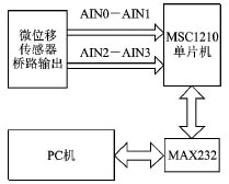 圖3為實(shí)驗(yàn)系統(tǒng)的電路結(jié)構(gòu)示意。實(shí)驗(yàn)系統(tǒng)主要由傳感器本體(輸出原始的模擬信號)、MSC1210核心、串口通信電路和PC機(jī)組成。如前所述,微位移傳感器一組橋路輸出分別接MSC1210 ADC的AIN0與AIN1,作為一路差分輸入;另一組橋路輸出分別接MSC1210 ADC的AIN2與 AIN3,作為第二路差分輸入。MSC1210通過RS232與PC機(jī)通信,實(shí)現(xiàn)信息的顯示和對MSC1210的控制。