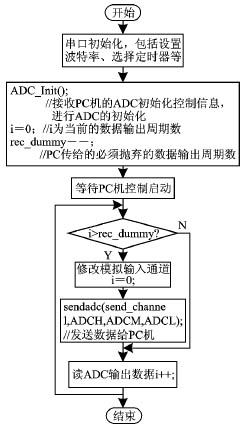對MSC1210 ADC的各個控制字的設(shè)置將會極大地影響傳感器的最終分辨率和穩(wěn)定性。例如,輸入緩沖器使用與否、可編程放大器增益的選擇、調(diào)制器時鐘速度選擇(決定模擬采樣率以及濾波器型號的選擇)等,這些參數(shù)的設(shè)定都不是一次完成的,有些要經(jīng)過反復(fù)的組合、嘗試,最終得到滿意的結(jié)果。為了避免每次修改程序后必須重新下載到Flash程序存儲器中,MSC1210在工作之前的ADC的初始化工作由PC機(jī)完全控制。首先,PC機(jī)將各種必要的控制信息通過串口傳給MSC1210,MSC1210根據(jù)這些信息來進(jìn)行ADC的初始化工作。具體地說就是,PC機(jī)向MSC1210發(fā)送6個字節(jié),這6個字節(jié)中包含了濾波器型號、ACLK、ADCON2和ADCON3寄存器中的抽樣值、修改模擬輸入信道后的延時值、必須拋棄的數(shù)據(jù)輸出周期數(shù)和可編程放大器的增益。然后,MSC1210啟動ADC的初始化工作。進(jìn)入正常工作狀態(tài)后,如果發(fā)現(xiàn)當(dāng)前數(shù)據(jù)輸出周期數(shù)已大于預(yù)先設(shè)置的必須拋棄的數(shù)據(jù)輸出周期數(shù),MSC1210就認(rèn)為這個輸出數(shù)據(jù)及其以后的輸出數(shù)據(jù)都是有效的了,但它并不立刻將數(shù)據(jù)發(fā)送給PC機(jī),而是要馬上修改模擬輸入通道,然后再使前一輸入通道的輸出是無效的,緊接著進(jìn)入下一個數(shù)據(jù)輸出周期。MSC1210的工作流程可簡單用圖4表示。