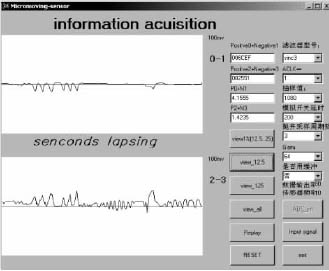 PC機(jī)除對MSC1210 ADC的初始化控制外,主要負(fù)責(zé)將MSC1210通過RS232串口發(fā)送上來的數(shù)據(jù)用可視化的圖形實(shí)時地顯示于窗口適當(dāng)位置。每次MSC1210向PC機(jī)發(fā)送4個字節(jié)。這4個字節(jié)是如下定義的:第1個字節(jié)表示傳感器的通道號,0表示AIN0與AIN1差分輸入,即X維的信息;1表示AIN2與AIN3差分輸入,即Y維的信息。后三個字節(jié)是輸出數(shù)據(jù)的24位二進(jìn)制表示,是MSC1210 ADC的轉(zhuǎn)換結(jié)果。當(dāng)PC機(jī)處理進(jìn)程檢測到輸入緩沖區(qū)滿4個字節(jié)后,讀取緩沖區(qū)的數(shù)據(jù),同時清空輸入緩沖區(qū)。根據(jù)第1個字節(jié)識別通道后,將數(shù)據(jù)轉(zhuǎn)換為電壓值后顯示到相應(yīng)位置(單位:mV),并且在窗口中開辟兩塊圖形顯示區(qū)域,分別實(shí)時顯示X軸和Y軸的信號變化情況。為了更好地觀測到信號的微小變化,進(jìn)程提供了圖形的放大顯示功能。為了方便,放大倍數(shù)可選為12.5倍和125倍。圖5為PC機(jī)與MSC1210的交互界面。