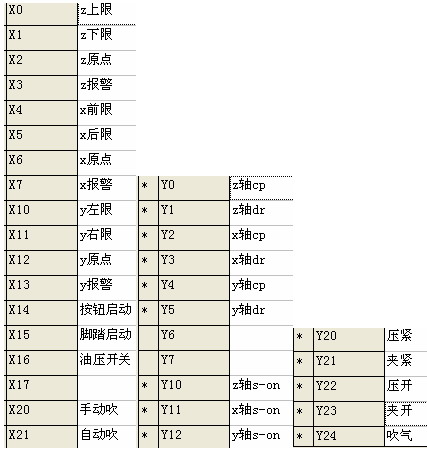 本系統(tǒng)分為三種運(yùn)行狀態(tài),手動(dòng)/單動(dòng)/自動(dòng)。手動(dòng)是調(diào)整調(diào)試試時(shí)候操作。工作的時(shí)候用單動(dòng)和自動(dòng)兩種運(yùn)行方式。單動(dòng)和自動(dòng)區(qū)別是單動(dòng)開一條槽,自動(dòng)是多個(gè)槽(根據(jù)開槽需要),單動(dòng)和自動(dòng)有獨(dú)立的配方各為20組,sv機(jī)種與EH機(jī)種一樣有廣闊的停電保持區(qū),所以都把配方做在plc里面。調(diào)整齒輪比使得三軸正常運(yùn)動(dòng)速度時(shí)讓plc輸出脈沖在100k以上。三軸分別負(fù)責(zé)上下z,前后x,左右y,各軸回歸要求快速,到開槽起始位置要求快速同時(shí)運(yùn)動(dòng)。