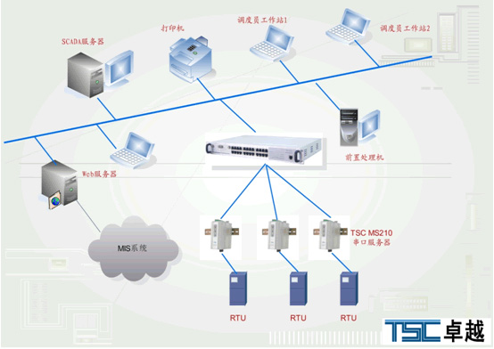 本案例中,縣級電力調(diào)度監(jiān)控系統(tǒng)和變電站集中控制中心(集控站)中大量采用了TSC公司的串口設(shè)備聯(lián)網(wǎng)服務(wù)器MS210系列產(chǎn)品,作為RTU(遠方數(shù)據(jù)采集單元)或其它數(shù)據(jù)采集設(shè)備通過串口通信接入SCADA局域網(wǎng)的解決方案。具有良好的性能價格比。