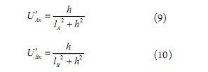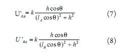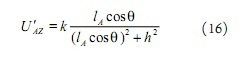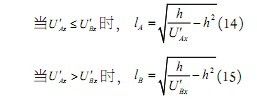 其中k是一個(gè)比例常數(shù),與電磁環(huán)境和具體的電磁線圈有關(guān),可以由實(shí)驗(yàn)確定,q是導(dǎo)線與小車坐標(biāo)系Y軸的夾角,如圖5。顯然,用(7)(8)式來求解lA和lB不是件簡(jiǎn)單的事情,最好能將cosq去掉。圖6顯示了當(dāng)q=20o,h=10,k=1時(shí),去掉cosq前后U'Ax的曲線。此時(shí),偏角q只在lA取值較小時(shí)才有一定的影響,同時(shí)當(dāng)q更小時(shí),這種影響會(huì)更加有限,因此,在近似分析中,可以將cosq去掉。為了分析方便,將(7)(8)式簡(jiǎn)化為: