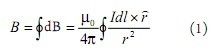 為了從電感線圈感應(yīng)電壓中獲得道路的信息,需要分析導(dǎo)線周邊磁場(chǎng)的分布。由畢奧-薩法爾定理可知,空間任一點(diǎn)的磁感應(yīng)強(qiáng)度可以看成是導(dǎo)線上電流元產(chǎn)生的磁場(chǎng)之和,即: