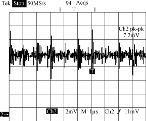 在探測(cè)元件無(wú)輸入信號(hào)時(shí),測(cè)量空間的電磁場(chǎng)輻射耦合到放大器的輸出信號(hào)。圖5為放大器的輸出信號(hào)示波圖。