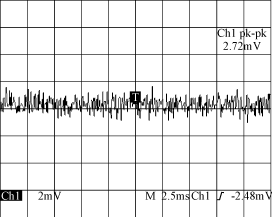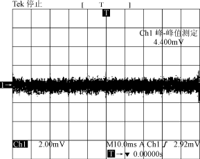 當(dāng)采取了上述改進(jìn)措施后,在探測(cè)元件無(wú)輸入信號(hào)時(shí),測(cè)量放大器的輸出信號(hào)示波圖如圖8所示。示波圖顯示放大器的輸出干擾信號(hào)峰—峰值為2.72mV,有了很大的改善。