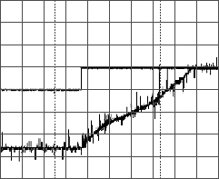 本文所介紹的兩個(gè)硬件已經(jīng)應(yīng)用在微機(jī)控制的高速平縫機(jī)中了,而且性能良好,工作穩(wěn)定,能夠達(dá)到預(yù)先的要求。圖6為腳踏板控制器的輸出開(kāi)機(jī)信號(hào)和速度控制給定信號(hào)。圖7為上下針位的信號(hào)。