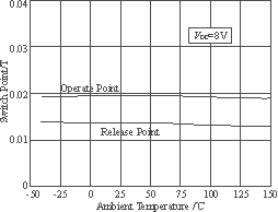 開(kāi)關(guān)型霍爾傳感器應(yīng)用非常簡(jiǎn)單,僅按照典型接法即可。這里選用的是Allegro公司的U3144。外圍電路僅須連接一個(gè)輸入電阻與一個(gè)輸出上拉電阻。圖4為開(kāi)關(guān)霍爾傳感器的典型應(yīng)用接法,圖5為該器件典型的動(dòng)作與釋放磁感應(yīng)強(qiáng)度曲線(xiàn)圖。
