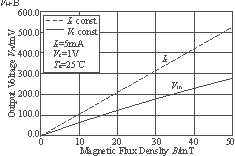 由式(1)可以看到,對(duì)于確定的霍爾器件,UH決定于控制電流IC和磁感應(yīng)強(qiáng)度B。若保持IC不變,則UH就可以在一定的磁感應(yīng)強(qiáng)度范圍內(nèi)隨B線(xiàn)性變化,所以,關(guān)鍵問(wèn)題就是使UH∝B。在給定的磁鐵和外形尺寸下,本文選用以InSb為材料的線(xiàn)性霍爾傳感器HW300B。其基本的資料可以參見(jiàn)HW300B的Data Sheet,這里僅給出其最基本的UH與B的線(xiàn)性曲線(xiàn)圖,如圖1所示。圖1中Vc為控制端所加的電壓,Ic為控制電流。
