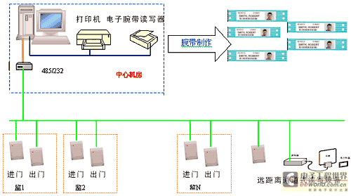 此部分由管教人員在手持式終端上操作完成上述功能,然后將統(tǒng)計數(shù)據(jù)上傳至管理電腦,出入登記通過電子腕帶閱讀器將數(shù)據(jù)采集上來,然后通過485總線傳輸至管理電腦,要求犯人出入監(jiān)區(qū)時都要在閱讀器上進(jìn)行感應(yīng)閱讀。