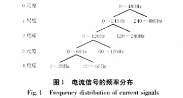 通常設(shè)計制造變壓器時,為了使鐵芯材料得到有效的利用,把正常運行時的磁感強度B值選擇在磁化曲線的‘膝點’附近,內(nèi)部短路故障時,鐵芯很容易飽和;當變壓器空投或區(qū)外故障切除,電壓恢復(fù)正常的過程中,由于磁通不能突變,磁通中出現(xiàn)非周期的暫態(tài)分量,與鐵芯剩磁一起使變壓器鐵芯飽和。故本文重點分析在變壓器鐵芯飽和狀態(tài)下,短路電流和勵磁涌流的區(qū)別。對電流信號進行小波多分辨率分析時,選用不同小波函數(shù),在不同尺度上得到的時頻特性也不同。本文提取的信號在不同尺度上的頻率分布如圖1所示。
