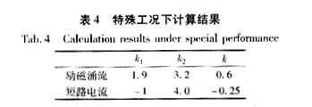 從圖5中可以看出,在鐵芯飽和狀態(tài)下,即使短路電流的二次諧波的含量高達15%,由于其三次諧波的含量很大,a′b′段斜率k1仍為負。從計算結(jié)果表4中可知,本判據(jù)依然有效(仍可通過k的符號區(qū)分鐵芯飽和狀態(tài)下內(nèi)部短路電流和勵磁涌流。)在實際運用中,設(shè)定k的閾值,可以區(qū)分勵磁涌流和短路電流(鐵芯飽和狀態(tài)下),從而在一定程度上有效的解決了在特殊工況下,因短路電流中二次諧波增大,導(dǎo)致變壓器差動保護誤判的問題。