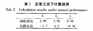 式(7)中j分別取2、3,得k1=(E(3)-E(2))/(3-2),反映了電流中所含2次諧波與3、4次諧波的能量變化;k2=(E(4)-E(3))/(4-3),反映了電流中所含基波與2次諧波的能量變化。判據(jù)k=k1/k2=( E(3)-E(2)) /((E(4)-E(3)),反映了電流信號中前四次諧波在不同尺度高頻段上的能量變化情況。由于勵磁涌流中2次諧波的含量大于其3、4次諧波,故圖3中其ab段斜率k1為正;而鐵芯飽和時,短路電流的能量譜圖中a′b′段斜率k1為負。計算結(jié)果如表2所示,通過判據(jù)k的符號即可區(qū)分鐵芯飽和狀態(tài)下內(nèi)部短路電流和勵磁涌流。