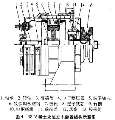 目前稀土永磁材料已經(jīng)具備了較高的性價比,現(xiàn)代電力電子技術也為研制出斬波式的電子穩(wěn)壓器奠定了基礎。因此,利用稀土永磁材料和現(xiàn)代電力電子元件研制出結構簡單、發(fā)電效率高、壽命長的42V稀土永磁發(fā)電機具有較高的研究價值和廣闊的推廣前景。