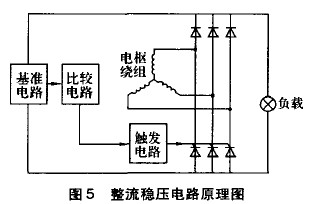 設計的釹鐵硼永磁發(fā)電裝置結構示意圖如圖4所示,還研制了三相半控橋整流穩(wěn)壓電路(圖5)。該電路由三相半控橋整流電路、電壓信號取樣電路和觸發(fā)電路組成。當發(fā)電機輸出電壓低于目標穩(wěn)壓值時,電子穩(wěn)壓器為三相整流輸出。當發(fā)電機輸出電壓高于目標穩(wěn)壓值時,電壓信號取樣電路自動使三相半控橋整流電路瞬時斷開,降低輸出電醫(yī)當發(fā)電機輸出電壓再低于目標穩(wěn)壓值時,三相半控橋整流電路再恢復工作,周而復始。通過整流、斬波,保證了發(fā)電機輸出電壓穩(wěn)定的直流電。