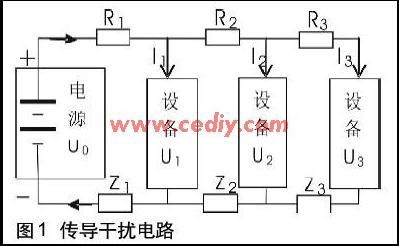 傳導(dǎo)干擾主要通過電路的共用導(dǎo)體傳播,典型的結(jié)構(gòu)是共電源線和共地線,圖1是典型傳導(dǎo)干擾電路示意圖。R為電源線上電阻,Z為地線上電阻,U為支路電壓,I為支路電流。