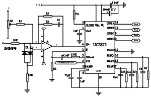 PWM移相控制是通過UC3875的誤差放大器來實現(xiàn)的,在UC3875的4角上接PI調節(jié)器,利用電壓傳感器將輸出電壓與給定基準電壓相比較,從而控制A、B與C、D之間的相位,最終調整波形占空比,使電源穩(wěn)定在預定值上。A/B、D/C兩個半橋,可單獨進行導通延時(即死區(qū)時間)的控制,在該死區(qū)時間內確保下一個功率開關器件的輸出電容放電完畢,為即將導通的開關器件提供電壓開通條件。