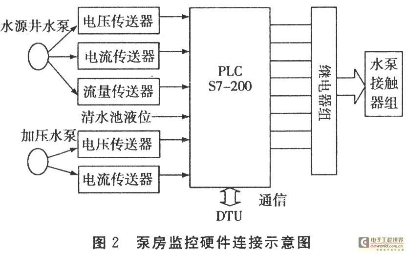 每個現(xiàn)場控制站配置一套控制柜。主要包括Siemens公司S7-200系列可編程序控制器、模擬量擴展模塊、GPRS傳輸設備、24VDC開關電源裝置、過電壓保護裝置、小型斷路器、接線端子、小型繼電器、安裝連接線纜及其它附件等控制設備。PLC控制設備并從設備上讀取信息,PLC設備與DTU連接,DTU實現(xiàn)了與中心機房控制計算機的無線數(shù)據(jù)交互.中心機房將控制信號通過無線方式發(fā)送給DTU,DTU控制PLC實現(xiàn)了中心機房對水泵的控制,泵房各種數(shù)據(jù)(電壓、電流、壓力、流量、水池液位等)通過PLC傳輸給DTU,DTU再傳輸給中心機房,存儲到數(shù)據(jù)庫中。硬件連接如圖2所示。