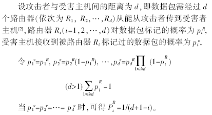 概率包標(biāo)記的思想[1]是路由器以固定的概率p標(biāo)記數(shù)據(jù)包,將路徑信息加入到IP頭中的16 bit識(shí)別域(ID)中,表示為(start,end,distance)。在路由器處產(chǎn)生一個(gè)[0,1]之間的隨機(jī)數(shù),如果這個(gè)隨機(jī)數(shù)小于p,路由器將自己的IP填入到start,同時(shí)將distance賦值為0;否則將自己的IP地址填入到end中;如果路由器以概率1-p不對(duì)包標(biāo)記,則將distance值加1。受害者從這些數(shù)據(jù)包中提出路徑信息,重構(gòu)出攻擊路徑。