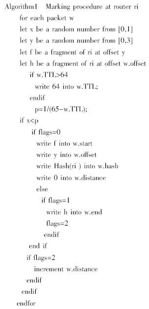 把32位的start路由器的IP地址和32位end路由器地址分為4塊,在start和end子域以等概率放置IP地址的4個(gè)8 bit的片段,并相應(yīng)地設(shè)置偏移offset子域值。路由器以概率p=1/d對(duì)數(shù)據(jù)包w進(jìn)行標(biāo)記。在路由器Ri 處,讓x為[0,1]之間的隨機(jī)數(shù),y為[0,3]之間的隨機(jī)數(shù),如果x<p,(a)當(dāng)flags=0時(shí),則把路由器Ri 的IP地址的第y個(gè)分片放入start域,distance域置為0;(b)當(dāng)flags=1時(shí),則表明start域已經(jīng)標(biāo)記過,把路由器Ri 的IP地址的第w.offset個(gè)分片放入end域,flags的值加1。如果flags=2,則表明數(shù)據(jù)包w的start、end域均已經(jīng)標(biāo)記過,直接將distance的值加1,轉(zhuǎn)發(fā)數(shù)據(jù)包。
