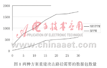 圖1橫坐標(biāo)為路徑長度,縱坐標(biāo)為重構(gòu)路徑時(shí)所需的數(shù)據(jù)包數(shù)目。從圖1可以看出,在重構(gòu)路徑時(shí),本方案重組攻擊路徑所需的攻擊數(shù)據(jù)包的數(shù)量隨著攻擊路徑長度的增加而增加,但增加的速度卻隨著路徑長度的增加逐漸減小,與傳統(tǒng)的標(biāo)記方法相比,傳輸路徑越長,本方案所需的數(shù)據(jù)包的個(gè)數(shù)就越具有優(yōu)勢(shì)。因?yàn)樾枰臄?shù)據(jù)包數(shù)量比基本包標(biāo)記少得多,計(jì)算量也會(huì)大大減少。所以本方案只需要少量數(shù)據(jù)包就可以在短時(shí)間內(nèi)重構(gòu)出攻擊路徑。