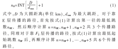 在短波通信的收發(fā)點(diǎn)位置確定以后,依靠E層及F2層反射的最少跳數(shù)由式(1)確定。