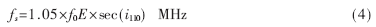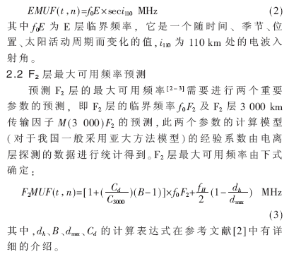 為了判斷是依靠E層還是F2層傳播,需進(jìn)行E層最大截止頻率的計(jì)算,當(dāng)工作頻率小于E層最大截止頻率時,認(rèn)為該頻率因被E層截止而不存在F2層傳播模式,E層最大截止頻率的計(jì)算公式為: