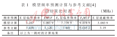 為了驗(yàn)證模型計(jì)算的準(zhǔn)確度,將本文的天波傳播衰減計(jì)算軟件與參考文獻(xiàn)[4]中提供的結(jié)果進(jìn)行了比對。由于參考文獻(xiàn)[4]中沒有各路徑的合成場強(qiáng)及總衰減的的數(shù)據(jù),因此主要對計(jì)算過程中的主要數(shù)據(jù)進(jìn)行比較,計(jì)算過程中各參數(shù)計(jì)算結(jié)果的一致性,如頻率、各路徑損耗計(jì)算結(jié)果的吻合,完全可以保障兩者最終衰減計(jì)算結(jié)果的一致性。