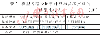 由于工作頻率7 MHz大于E層的遮蔽頻率,所以電波穿透E層,依靠F2電離層來進(jìn)行反射,故只對F2層各模式的損耗進(jìn)行計(jì)算,模型計(jì)算與文獻(xiàn)比對的結(jié)果如表2所示。