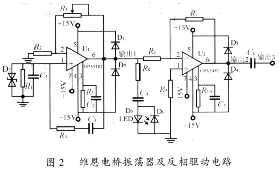 維恩電橋振蕩器及其反相驅(qū)動電路如圖2所示。振蕩頻率由R1、R4、C1、C3決定,基本不受功率運算放大器本身和電源的影響。應選用1/1000精度的金屬膜電阻和高性能的聚酯電容以保證頻率穩(wěn)定。自激振蕩器工作原理:運算放大器并非理想器件,一旦電路上電,運算放大器會產(chǎn)生輸出噪聲,通過反饋網(wǎng)絡(luò)R4、C3反饋至運放的同相輸入端,成為輸入信號。由于正反饋作用,形成正弦振蕩,并且振幅逐漸增大,直至接近電源電壓,輸出振幅達到飽和,通過調(diào)節(jié)可變電阻R3改變運放增益,使輸出正弦波幅值達到所要求的范圍。