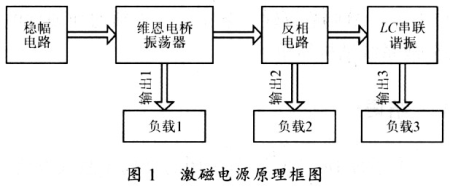 圖1是自激式激磁電源原理框圖,根據(jù)實際供電電壓的情況和負載的具體要求,可提供相同頻率的3種不同幅值的正弦波輸出。基于功率運放的維恩電橋振蕩器產(chǎn)生基本的正弦波輸出;經(jīng)過功率運放反相后,從其輸出端和反相輸入端可得到幅值疊加為基本正弦波幅值2倍的頻率相同的正弦波輸出;對于感性負載,可通過串聯(lián)諧振電容,利用LC串聯(lián)諧振原理得到更高幅值的輸出。