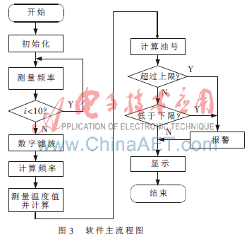 為了提高測量精度,提高系統(tǒng)的抗干擾性能,在系統(tǒng)中采用了軟件抗干擾的方法。在測量頻率信號時,對于每個頻率信號測量10次,測量完后通過算術(shù)平均濾波的方法得到該測量的頻率值。系統(tǒng)具體的軟件流程圖如圖3所示。