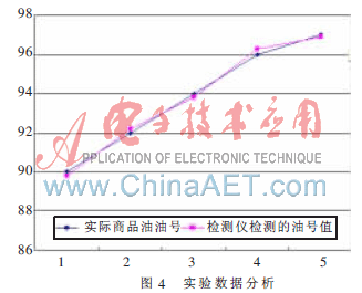 通過對市場上出售的汽油進(jìn)行采樣測試,結(jié)果如圖4所示??梢姕y試結(jié)果存在一定的非線性,原因可能是標(biāo)定的汽油的辛烷值并不是整90#或97#,這是因為汽油在出廠定標(biāo)時采用的是分級的近似方法。