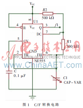 但電容的變化仍不易直接測量,因此本系統(tǒng)采用C/F變換電路把電容的變化轉(zhuǎn)化為頻率的變化,用單片機(jī)的計數(shù)和定時功能測量頻率,根據(jù)頻率和辛烷值的函數(shù)關(guān)系來計算汽油的辛烷值。轉(zhuǎn)換電路選用NE555芯片組成一個多諧振蕩器完成C/F變換,該芯片的最高工作頻率為500 kHz。C/F變換電路如圖1所示。轉(zhuǎn)換后頻率公式為: