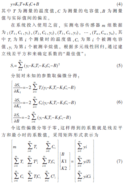 由式(1)可以得到,也就是說當(dāng)系統(tǒng)采集了頻率信號,將頻率信號轉(zhuǎn)換為電容值后就可以計算出介電常數(shù)。但是為了確保液位傳感器的精度,考慮到溫度、被測介質(zhì)特性和罐體等差異,在系統(tǒng)投入使用前先對該傳感器進(jìn)行數(shù)字校準(zhǔn),得到介電常數(shù)的方程式。本系統(tǒng)采用最小二乘法進(jìn)行擬合。在系統(tǒng)工作前,根據(jù)大量電容值與辛烷值的數(shù)據(jù),在計算機(jī)上用多元線性回歸法建立辛烷值與電容值的數(shù)學(xué)模型,擬合多項式為定義汽油標(biāo)號y與電容值和溫度等物理量的函數(shù)關(guān)系為:
